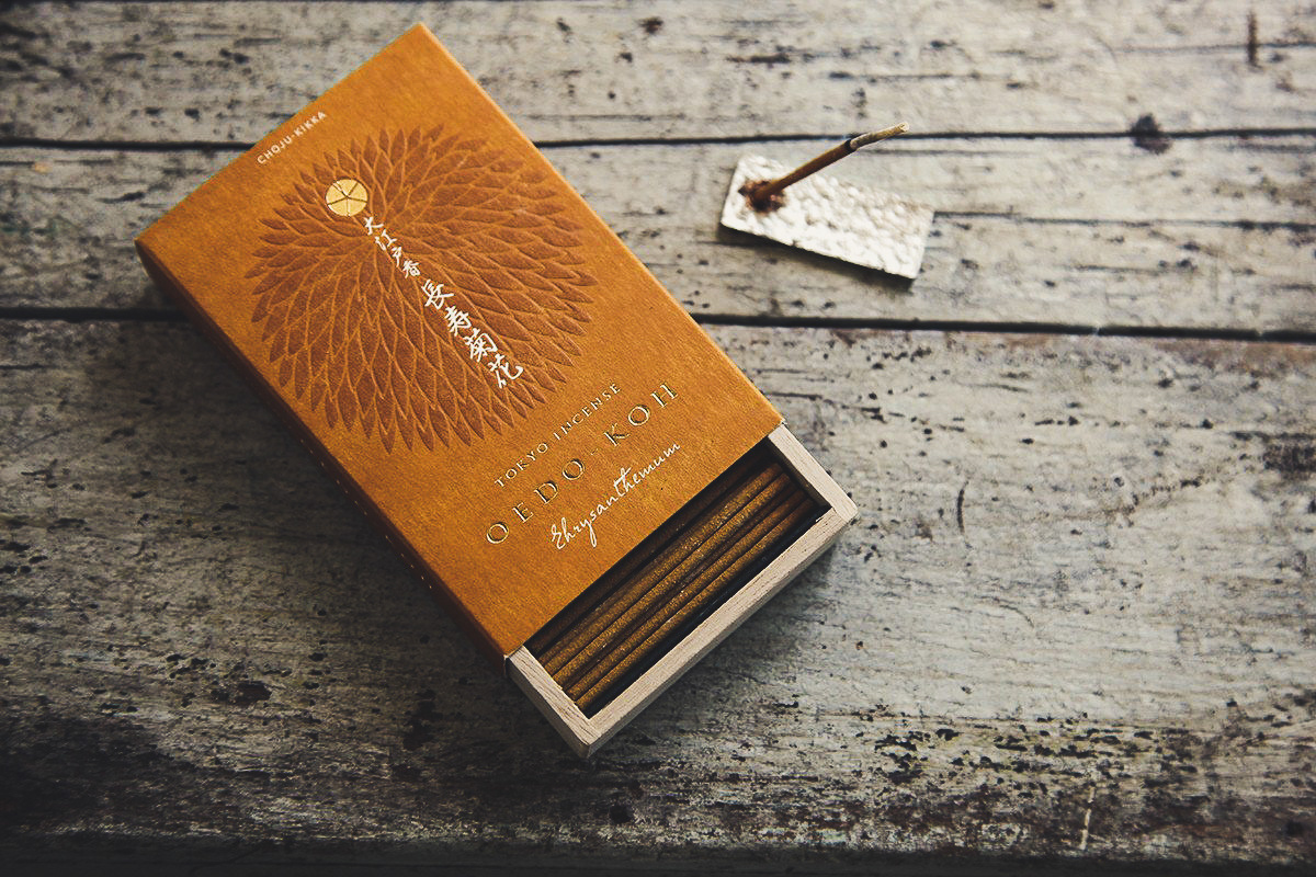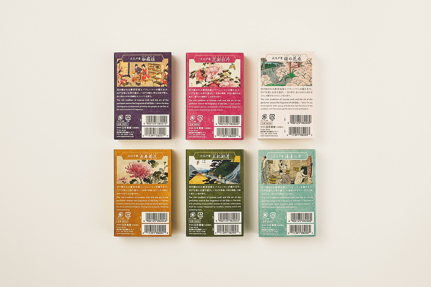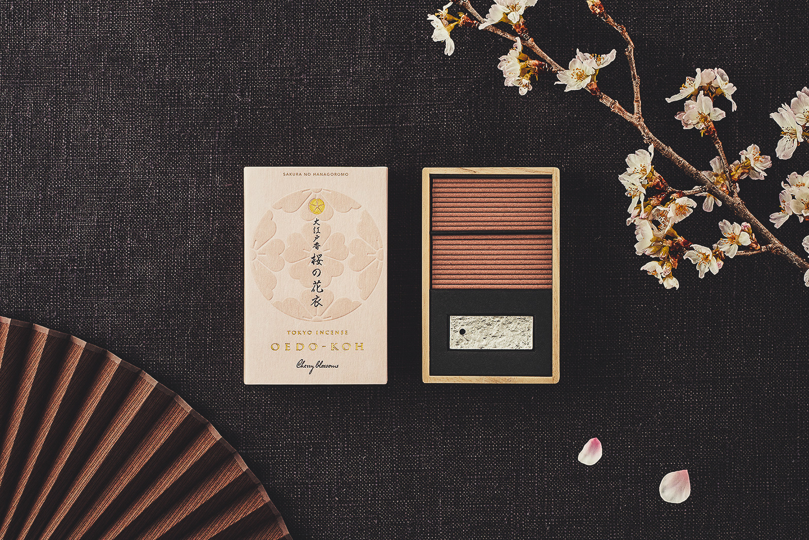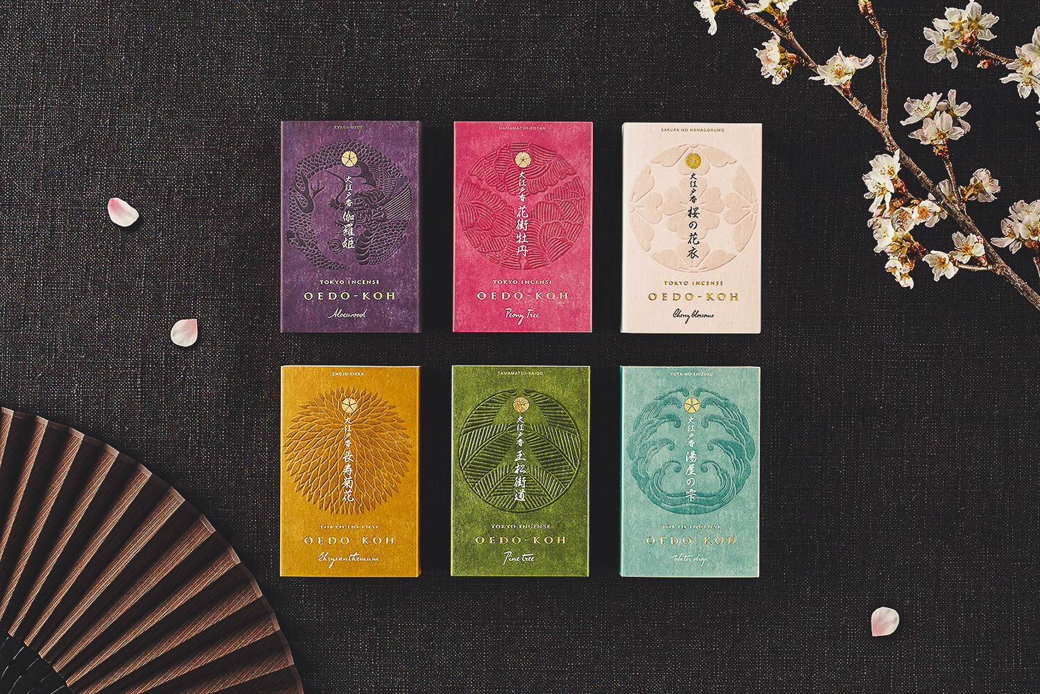 Developed the product branding for "Oedo Ko," an incense inspired by the scents of Edo (historical Tokyo), including the logo and packaging. The design features a traditional paulownia box sleeve that captures the classic Edo atmosphere while appealing to both international visitors to Tokyo and domestic customers who are open to new experiences. The fragrance visuals are expressed using family crests, and the interior and back of the box showcase how the scents were intertwined with the lives of people during the Edo period.
