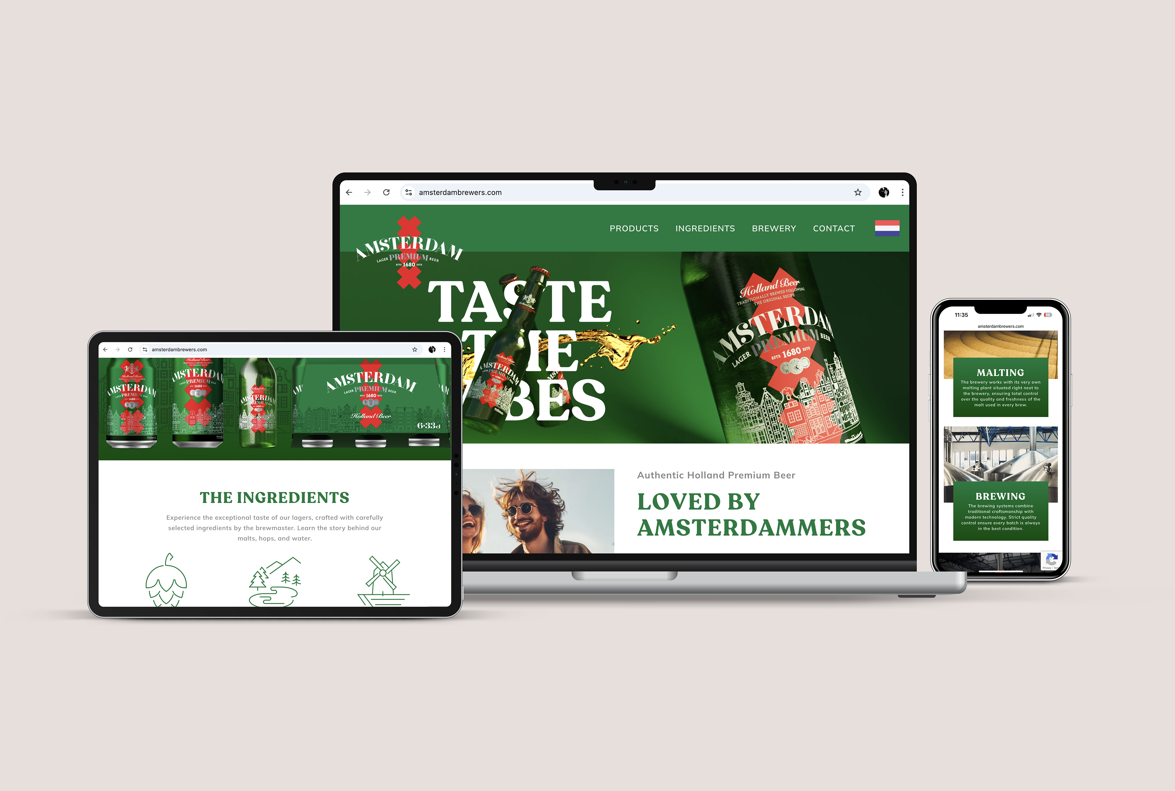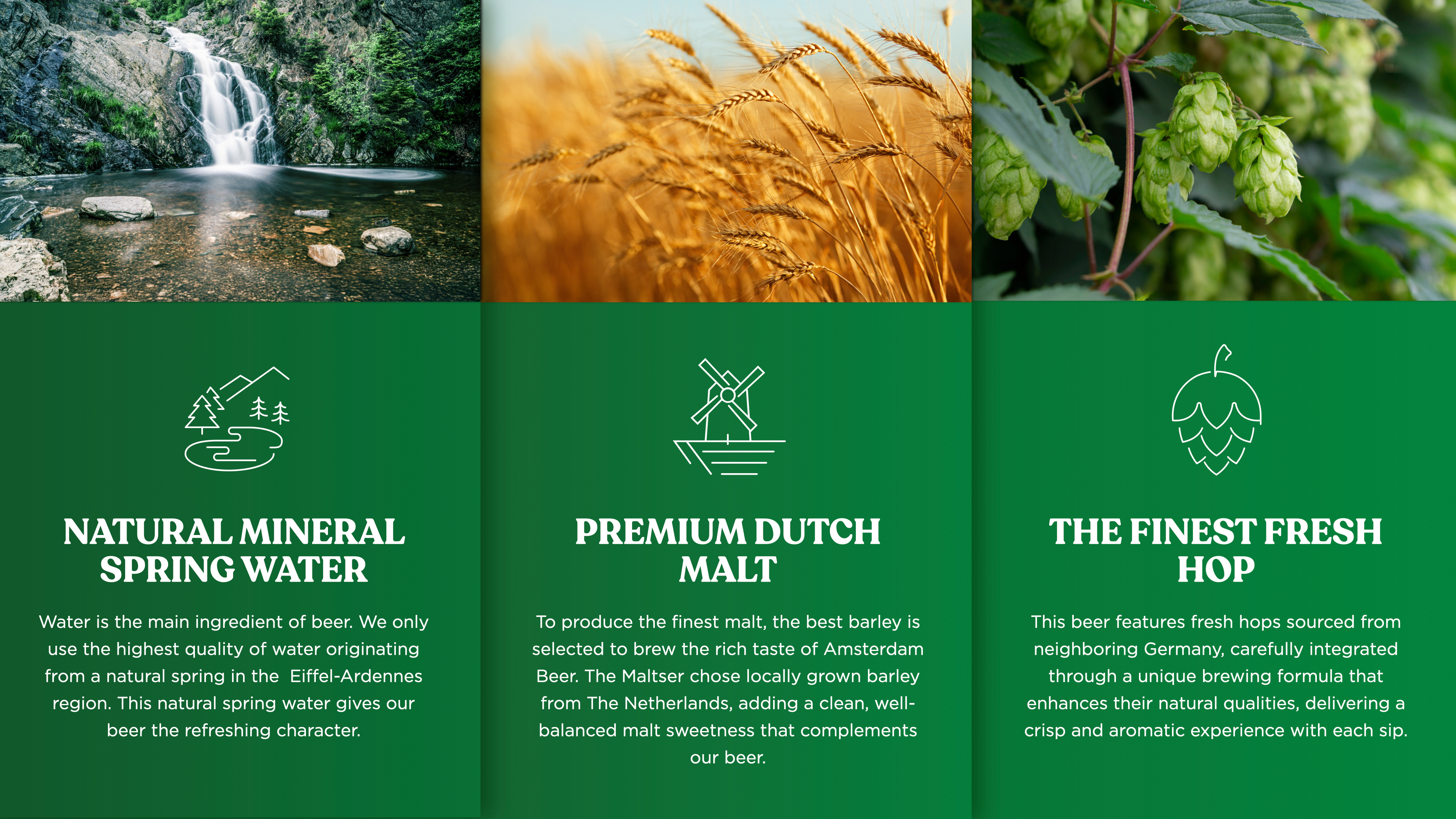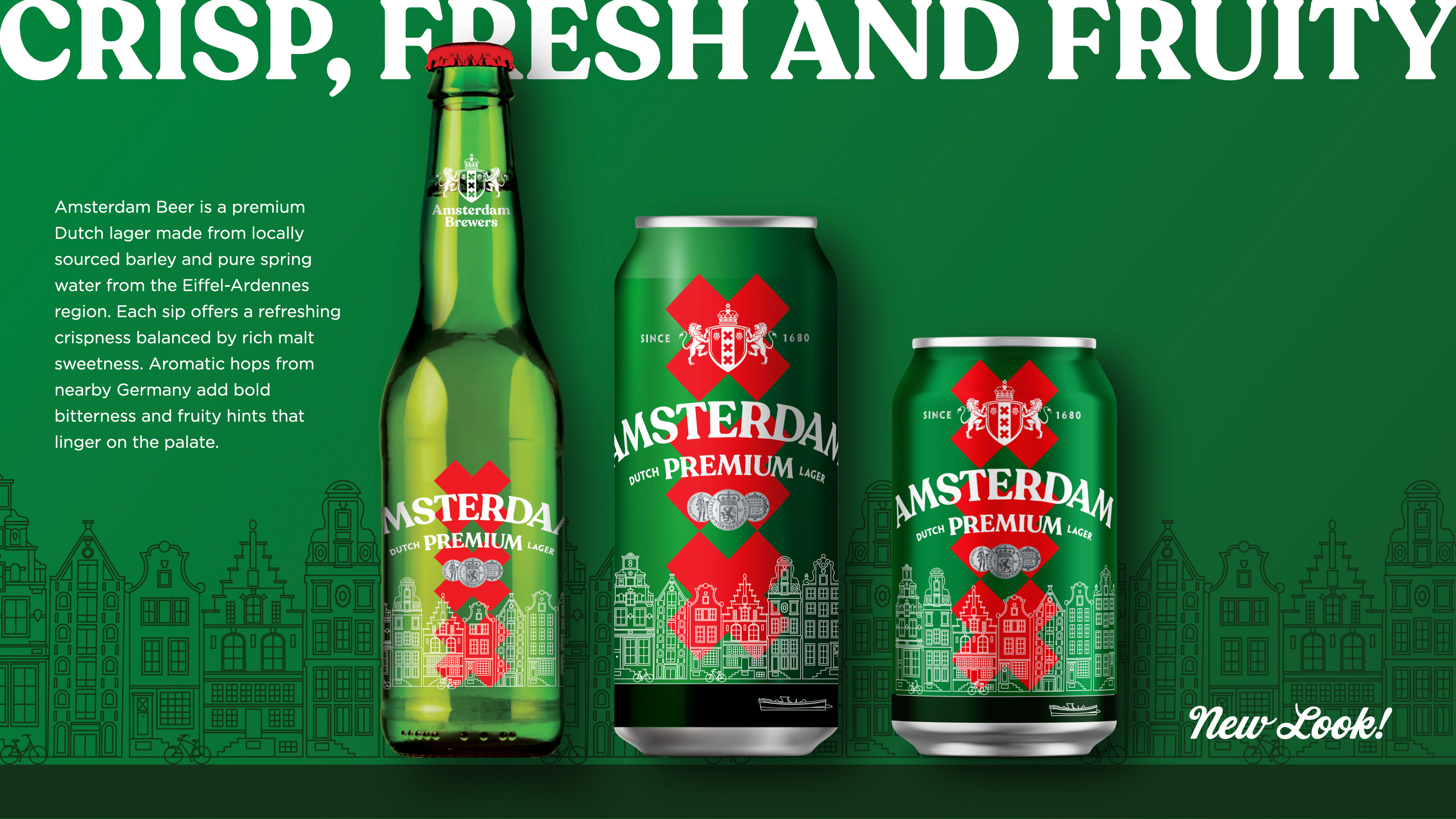 I was responsible for the brand design of Amsterdam Beer, a lager brewed in the Netherlands, which includes the logo, packaging, and website. The client requested a design that communicates its identity as Amsterdam beer, is friendly, and maintains a classic style without becoming too casual like contemporary craft beer designs, ensuring it would be timeless. In response, I arranged the traditional Amsterdam red XXX mark and a charming view of the houses against a green background that complements the Amsterdam Beer bottle.