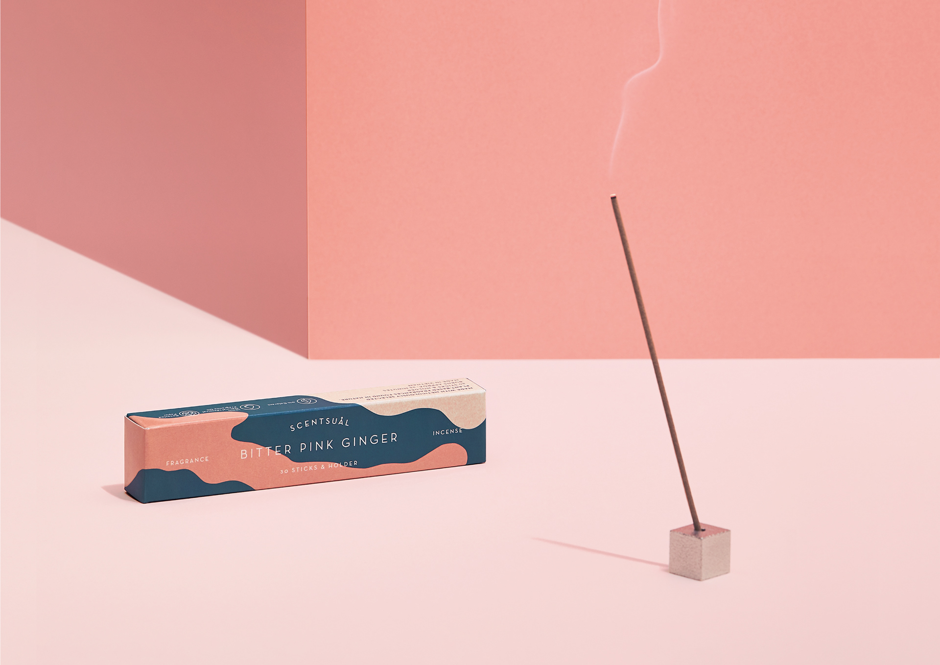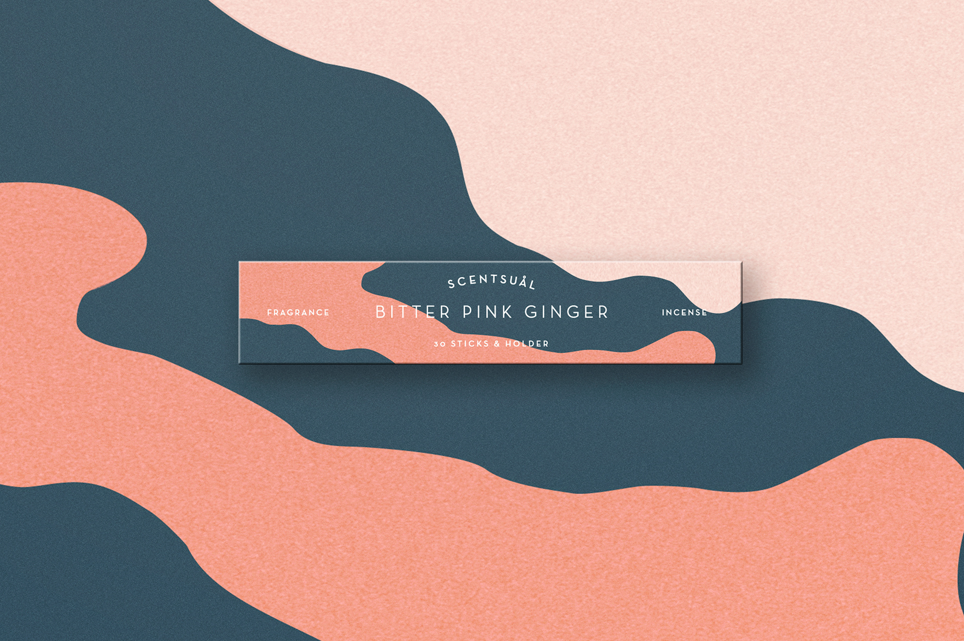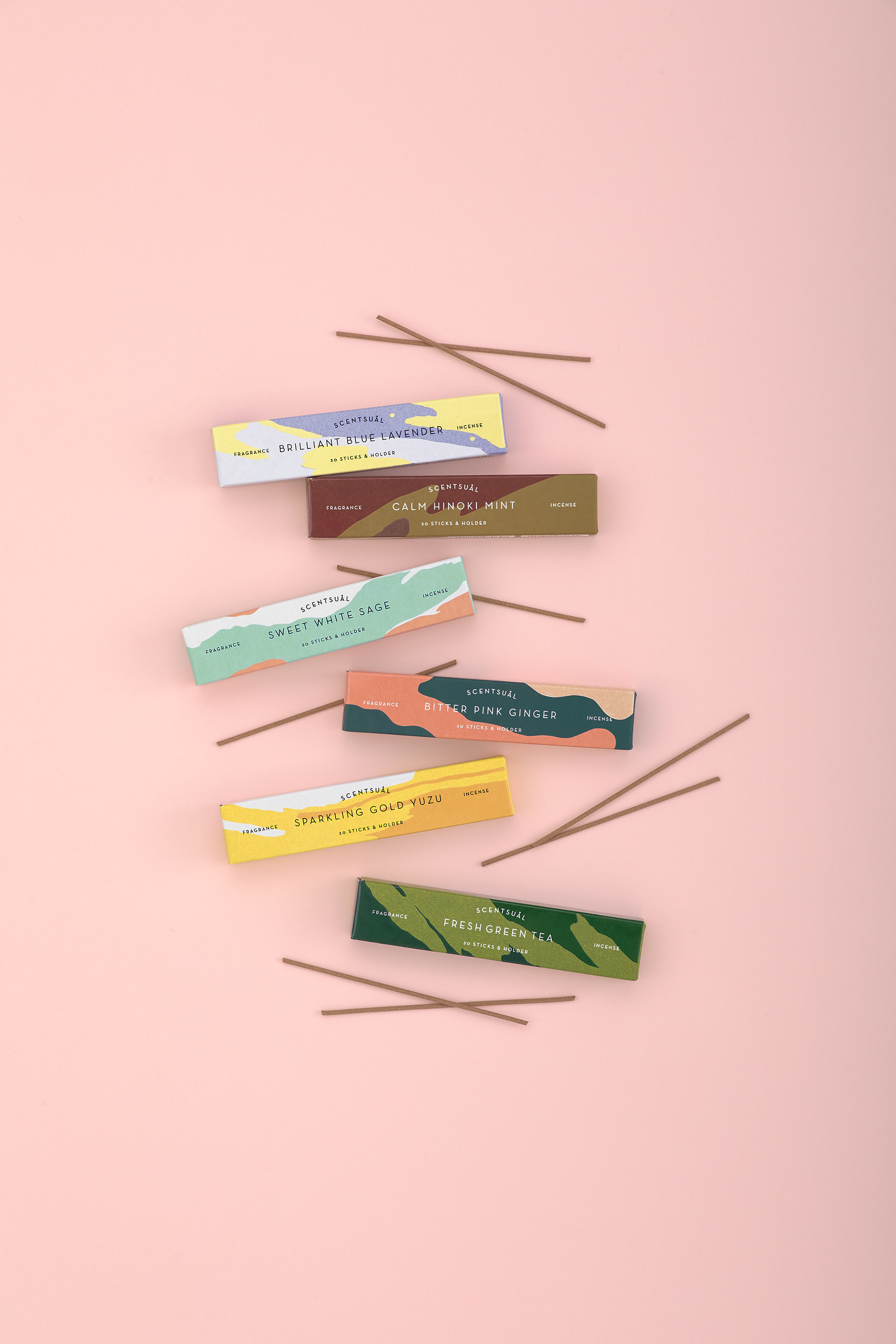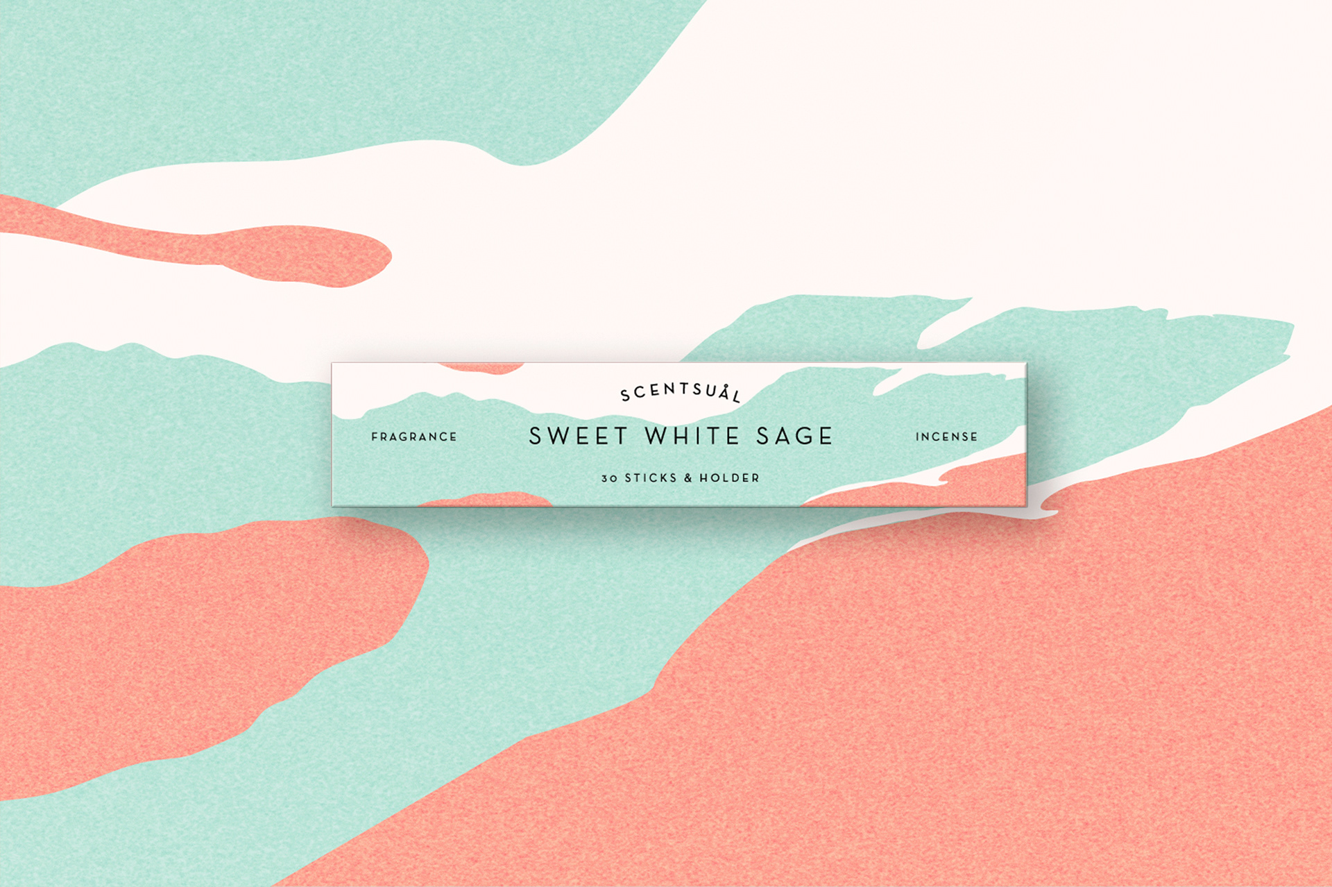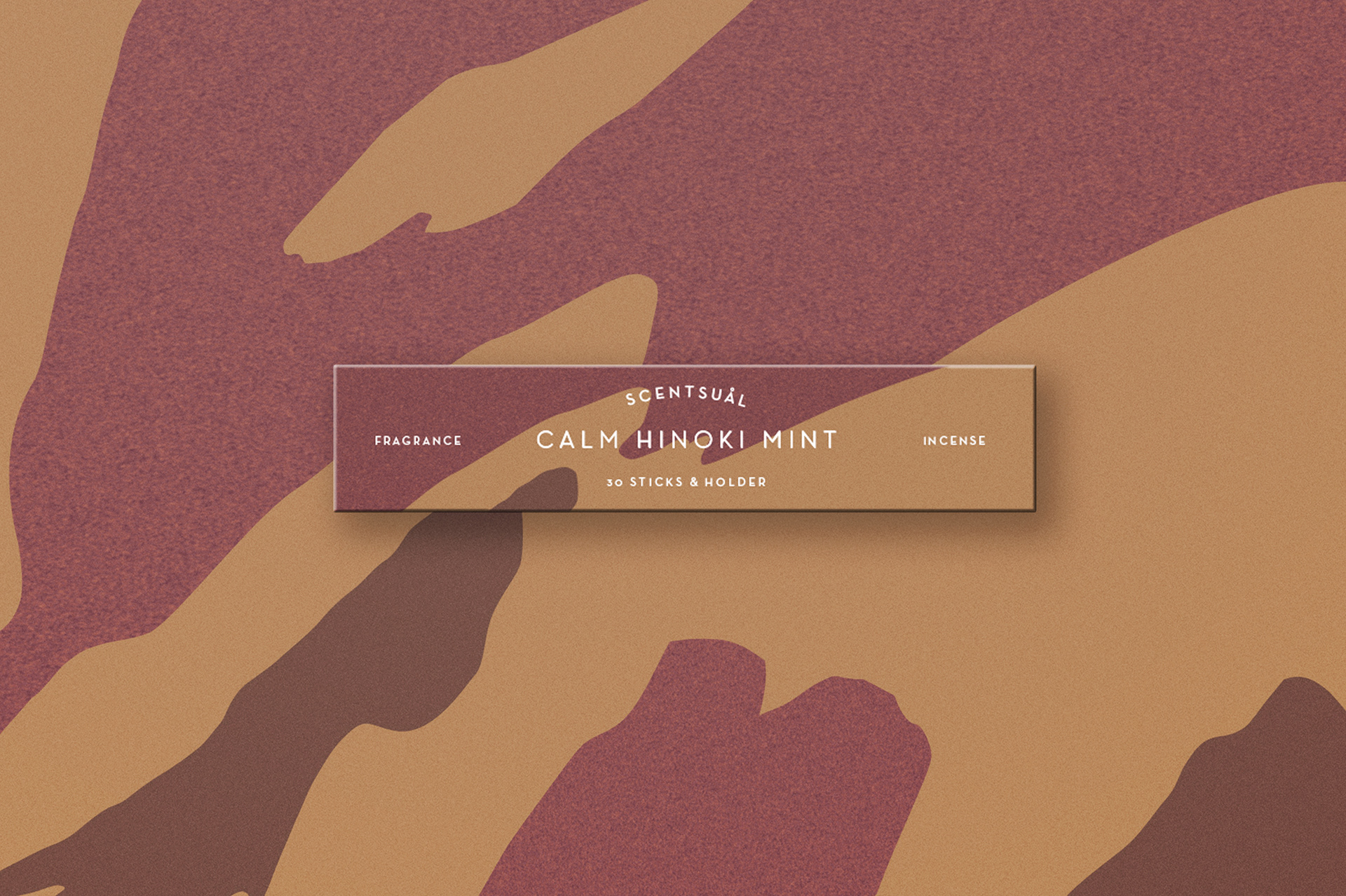 The product branding for the plant-based incense "Scentual," including the logo and packaging, was created to reflect a natural concept while also looking fun and youthful, as the client wanted. The design features colourful patterns inspired by rainbow eucalyptus. This organic pattern highlights the brand's bright and natural personality.