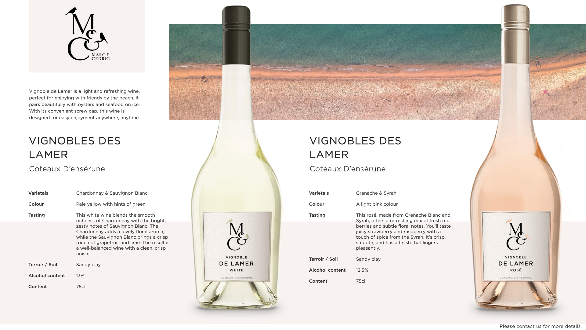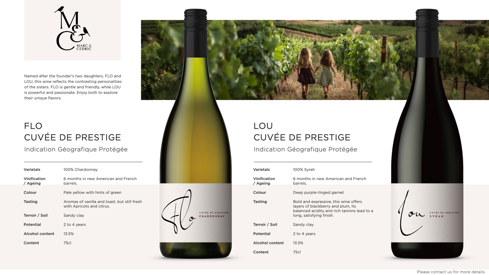 I contributed to the launch of the South French wine brand 'Marc & Cedric,' overseeing its overall product branding. I designed the logo, website, individual product packaging, and marketing materials, bringing together a modern essence with an elegant style. The founders, Marc and Cedric, are symbolically represented as a rare type of shrike native to the winery, a motif seamlessly integrated throughout the visual assets.